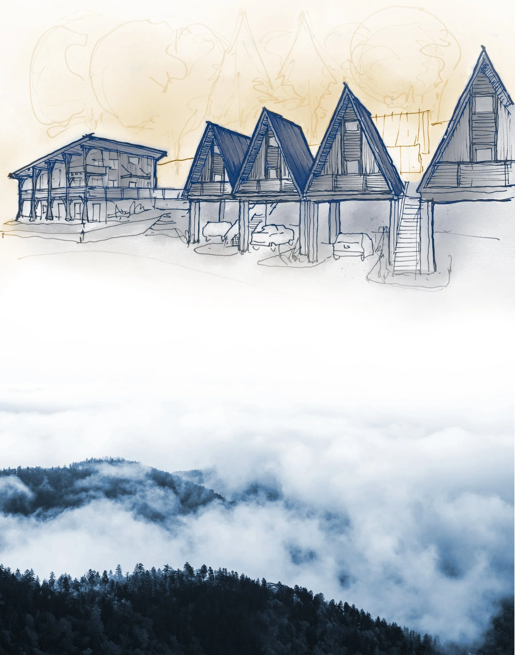 Wrong Way River Lodge & Cabins is a hospitality project that emerged from Asheville’s deep connection to the outdoors. Sixteen A-frame cabins and a two-story River Lodge are thoughtfully nestled along the French Broad River Corridor, placing guests at the center of the region’s most accessible outdoor recreation.